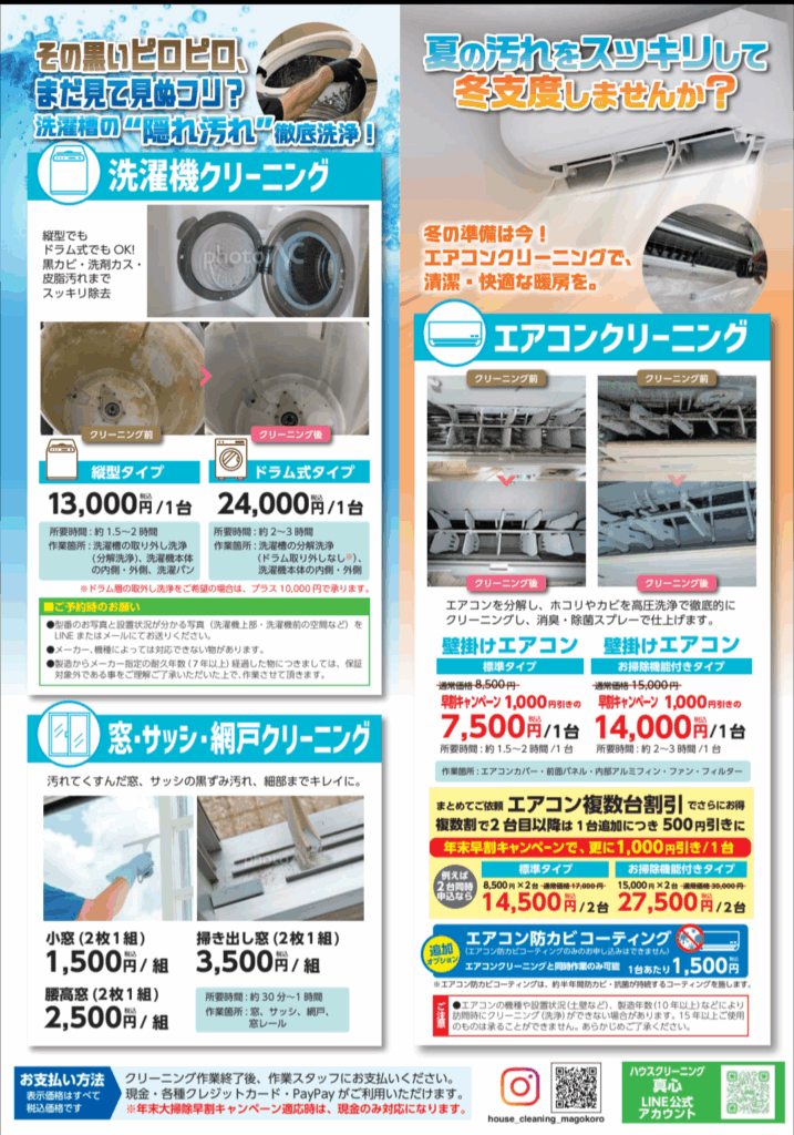 各水回り、エアコン、洗濯機、窓サッシ網戸クリーニングなど、ご家庭から